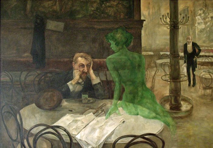 The Green Fairy was, so to speak, the muse of these bohemian artists. Because that was what they consumed in the cafes and cabarets of Montmartre. Yes, the “Fée Verte” was how they called absinthte, a pale green beverage with a degree of alcohol that would have knocked down any honorable member of the SPR at the first sip. But the bohemian artists swallowed absinthe as if it were lemonade. Today we know that this drink has hallucinogenic properties and it’s advisable to avoid it because you can go crazy. In fact, this explains many things about the biographies of these artists. To avoid talking about Van Gogh’s ear, which is an overused story, I will mention a lesser-known painter: Marcel Rochechouart, landscaper or portraitist (depending on whether you look at his paintings upside down or right), who fell in love with the Green Fairy and, as is typical of lovers, did not want to separate from her. It is estimated that approximately thirty percent of all absinthe produced in France at that time went to the stomach of Rochechouart. No wonder then that the world for him was pale green, as his paintings attest, and that his paranormal idyll with the “Fée Verte” did not end quite well. Indeed, one day he woke up wanting to exercise and, as he was a great swimmer and it was summertime, he threw himself into the river Seine from a bridge with the intention of crossing the Atlantic and, after a brief stop in New York to regain strength, swimming back home to be there at dinner time. Needless to say, the dinner got cold.